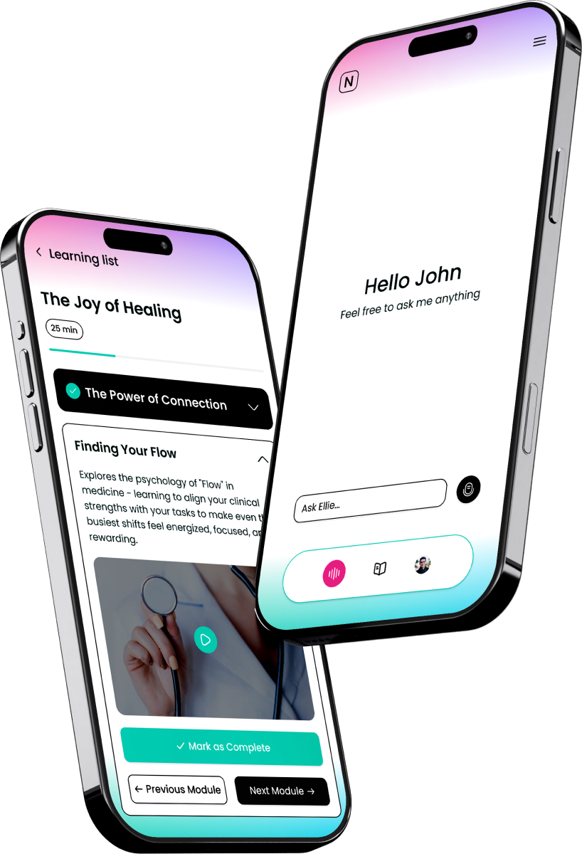 ELLIE is the AI companion within the NIDUS platform, designed to support nurses through reflection, wellbeing conversations, and guided learning. She offers a calm, confidential space to think through challenging moments, build insight, and maintain professional resilience.